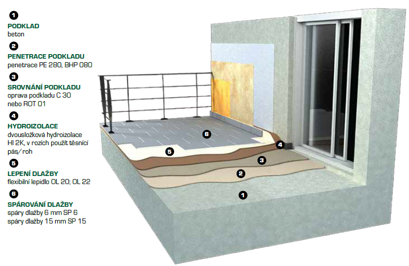 Hydroizolaci den před lepením dlažby doporučujeme opatřit adhezním můstkem BRALEP BHP 080 ve velmi tenké vrstvě. Dlažbu lepíme flexibilním lepidlem BRALEP OL 20 nebo OL 22.