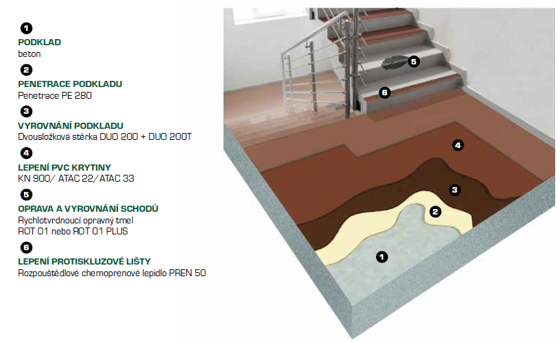 Lepení protiskluzových a schodišťových lišt a soklových profilů provedeme rozpouštědlovým chloroprenovým lepidlem PREN 50.